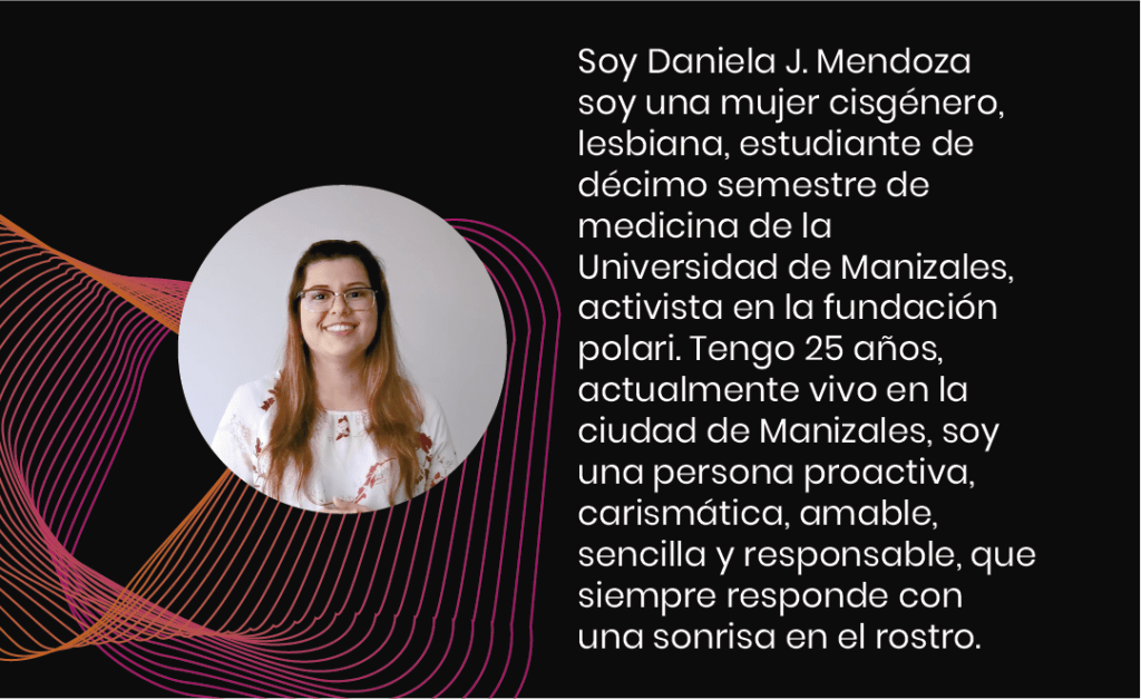 Soy Daniela J. Mendoza soy una mujer cisgénero, lesbiana, estudiante de décimo semestre de medicina de la Universidad de Manizales, miembro activo del comité de ética médica de la IPS CEPAIN sede Manizales, activista en la Fundación Polari, integrante del semillero de investigación de sexología de la Universidad de Manizales, fiscal del Equipo de Líderes de la Universidad de Manizales, tengo 25 años, actualmente vivo en la ciudad de Manizales, soy una persona proactiva, carismática, amable, sencilla, responsable, positiva, abierta, comprensiva que siempre responde con una sonrisa en el rostro, me encanta hablar todo tipo de temas, disfrutar con quienes amo y hacer lo que me apasiona. Me siento dichosa al saber que están realizando este curso, que cada vez seamos más personas con un pensamiento incluyente y más tolerante, pues creo que el cambio empieza a partir de pequeñas acciones que se suman en una sola grande. Gracias totales.